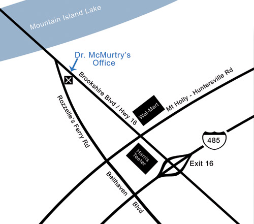 Our dental office is located in northwest Charlotte, near the corner of Rozzelle's Ferry Rd and Hwy 16 in Mountain Island Village.